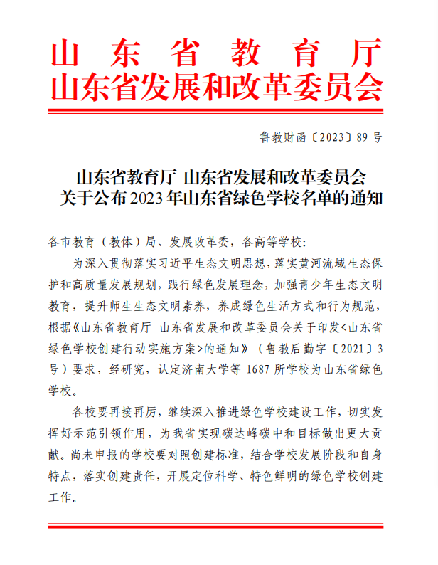 近日,山东省教育厅、山东省发展和改革委员会公布2023年山东省绿色学校名单,LETOU官网成功获评“山东省绿色学校”称号。
