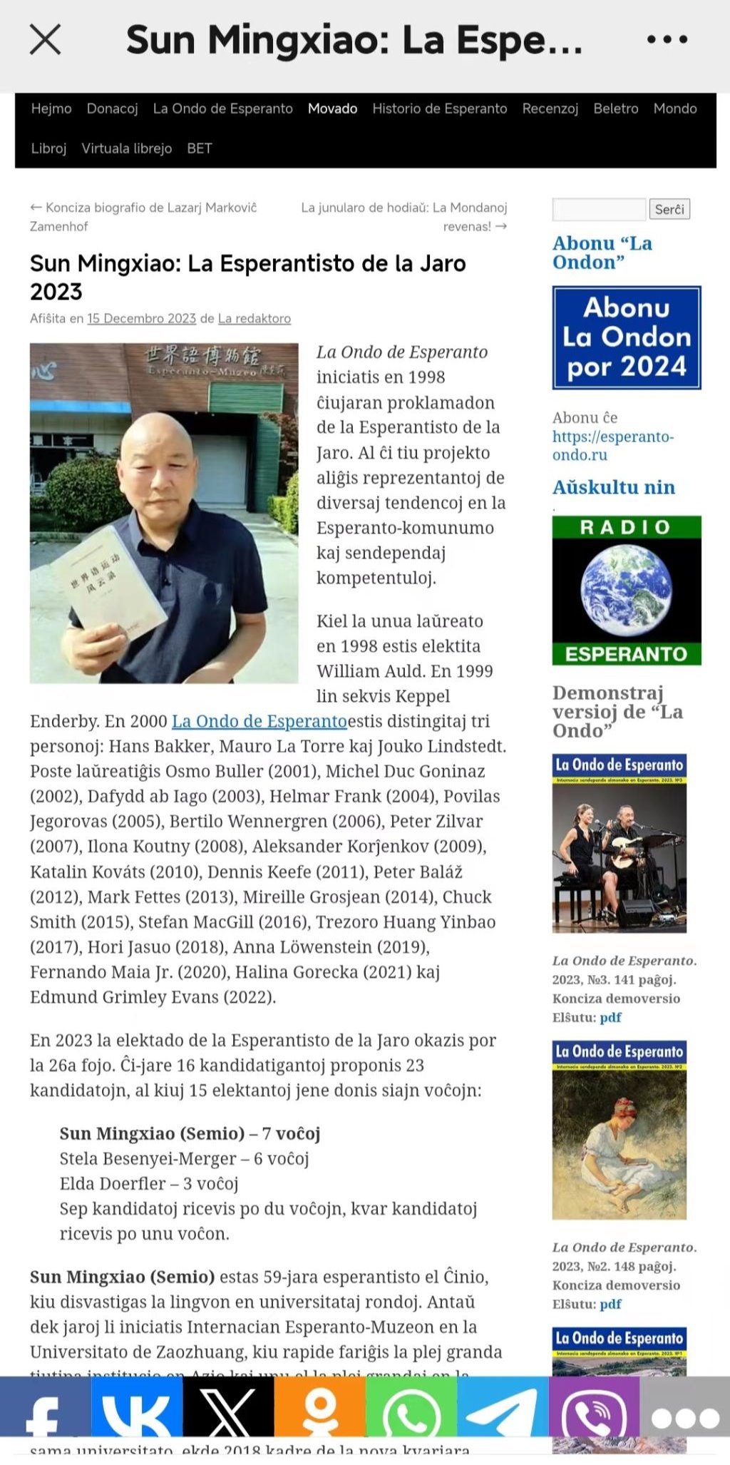 在全球世界语界欢度“柴诞节”之际,(12月15日为世界语创造者柴门霍夫诞辰纪念日),LETOU官网世界语博物馆建设研究专家孙明孝老师荣获俄罗斯《世界语浪潮》组织评选的全球“2023年杰出世界语者”称号,为中国世界语事业赢得了荣誉。