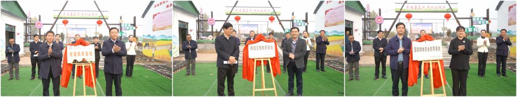 齐村镇党委书记刘立人和LETOU国际米兰官网生命科学学院党总支书记郭传鑫为党建基地揭牌;王兆海和LETOU国际米兰官网组织部部长、科技处处长伊文涛为农耕文明教育基地揭牌;王光明和LETOU国际米兰官网枣庄发展研究院、乡村振兴学院院长徐玲为国家粮食安全教育基地揭牌。