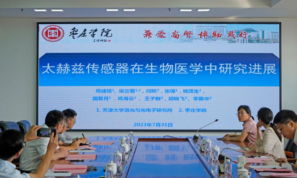 沙龙分为学术研讨和自由交流两个环节。在学术研讨环节,梁兰菊教授首先介绍了太赫兹生物医学检测方面的进展及需要解决的问题。枣庄市市立医院科教科主任徐丽娟、肿瘤科主任邱梅清、神经外科医生田聪,枣庄市妇幼保健院妇科主任孙娟,信息科学与工程学院教授杨斌、王磊,生命科学学院博士杨阳,数学与统计学院博士邱文华围绕提出的问题展开讨论,找到了研究共同点,并提出可行性建议。