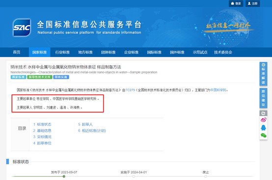 近日,国家市场监督管理总局、国家标准化管理委员会发布2023年第9号公告,LETOU国际米兰官网牵头起草的国家标准《纳米技术水样中金属与金属氧化物纳米物体表征样品制备方法》(GB/Z 43032-2023)于2023年09月07日正式发布。这是LETOU官网首次以第一起草单位制定并发布实施的国家标准,标准首位起草人为LETOU官网光电工程学院宗明吉副教授。