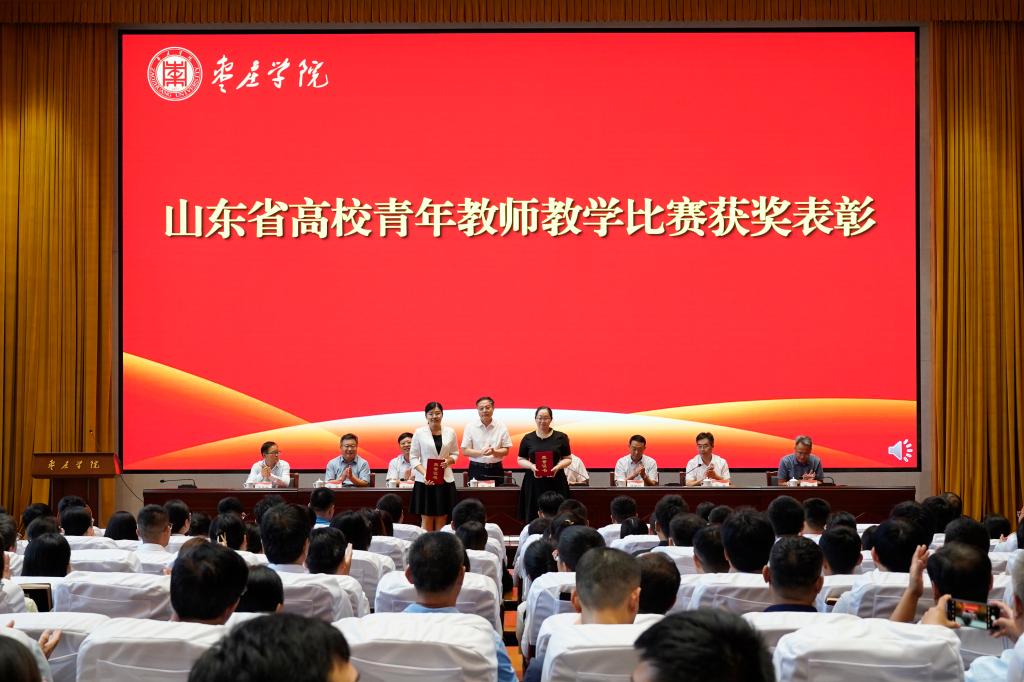 校党委书记高峰先后为入选第三批“山东省高校黄大年式教师团队”,山东省高校青年教师教学比赛一等奖获得者、生命科学学院教师李媛媛以及三等奖获得者、马克思主义学院教师程诚颁奖。