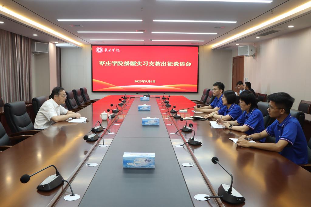 文学院院长张爱民代表支教团派出学院发言,希望支教团全体师生切实担负起立德树人使命,发扬“枣院精神”,以积极饱满的热情和认真负责的态度,把教学和管理工作抓实、抓细、抓好,用激扬的青春和奋斗的汗水谱写“大美枣院”的光荣与梦想。支教团团长何芳代表带队教师发言,表示将不负重托,肩负起援疆支教工作的责任与使命;不负期待,履职尽责,圆满完成教书育人工作;不负韶华,团结互助,将支教团打造成为一个积极向上、团结奋进的战斗集体。外国语学院王修俊代表支教团学生郑重承诺,将会坚定政治方向,自觉遵守国家民族政策,以争做“四有”好老师为目标,在支教实践中磨炼意志、完善自我、坚守初心,以青春的力量书写时代新篇章。