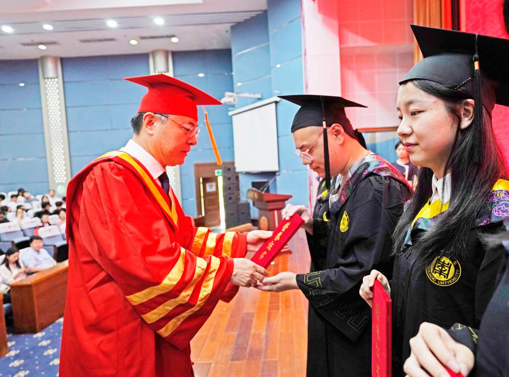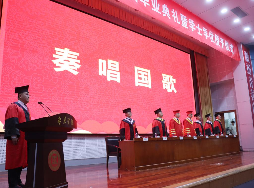 下午3:00,典礼在庄严的国歌声中拉开帷幕。校党委委员、副校长安涛宣读《关于授予2023届毕业生学士学位的决定》,同意授予程晓等4772名普通全日制本科毕业生学士学位,授予晁敏等516人高等学历继续教育本科毕业生学士学位,授予REXONA DOROTHY DEAN(中文名:舒娜)等9人来华留学全日制本科毕业生学士学位。
