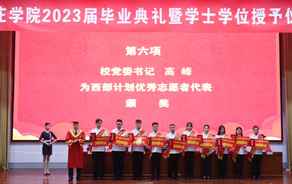 校党委委员、副校长李目海宣读《关于表彰2023届优秀毕业生的决定》。校党委委员、纪委书记、省监委驻LETOU国际米兰官网监察专员路绪剑宣读《关于表彰“LETOU国际米兰官网2023年大学生志愿服务西部计划优秀青年志愿者”的决定》,对马克思主义学院李晓燕等20名西部计划志愿者进行表彰,并每人颁发3000元奖学金。校党委书记高峰先后为优秀毕业生代表、西部计划志愿者代表颁发荣誉证书,与同学们亲切握手并合影留念。