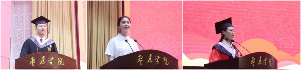 外国语学院2019级世界语专业宋振远作为毕业生代表发言,回顾了在枣院的学习和成长历程,表达了对母校的眷恋不舍和对未来的无限憧憬,并郑重承诺将以信仰之笔写青春坚守、以担当之墨写青春奉献、以实干之纸写青春业绩、以匠心之砚写青春价值,让青春在祖国和人民最需要的地方绽放绚丽之花。音乐与舞蹈学院2021级音乐学专业王艺霏作为在校生代表发言,表示将以学长为榜样,练就过硬本领,争做时代先锋,以拳拳赤子之心谱写辉煌的人生华章。心理与教育科学学院徐愫芬作为教师代表发言,向2023届全体毕业生致以衷心祝贺,并勉励他们要学会认知、学会做事、学会共处,心系家国,敢于担当,在今后的人生道路上披荆斩棘,乘风破浪。