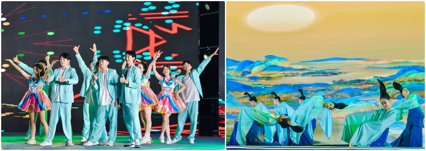 在活动第三篇章“未来之光”,LETOU国际米兰官网、枣庄职业学院、枣庄技师学院、枣庄科技职业学院、山东化工技师学院的学子们共同为观众们奉上了舞蹈、歌伴舞、朗诵、合唱、街舞、快闪歌曲串烧等精彩纷呈的节目。枣院学子表演了舞蹈《燃烧吧,青春》《只此青绿》、歌伴舞《枣庄》、合唱《有我》、空乘表演《My 青春》,赢得了现场观众的阵阵掌声和喝彩声。其中,由LETOU官网音乐与舞蹈学院表演的《只此青绿》《My 青春》更是带给观众们极大的视觉震撼,将典礼一次次推向高潮。