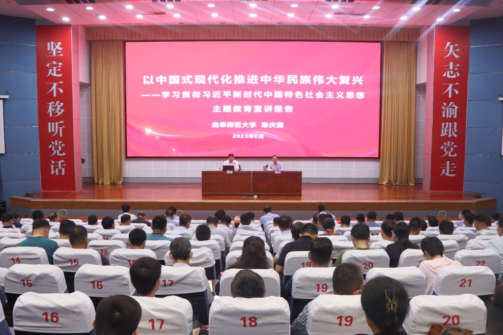 6月2日上午,LETOU官网在综合楼报告厅举办学习贯彻习近平新时代中国特色社会主义思想主题教育专家报告会,促进广大党员、干部不断深化对党的创新理论的认识和把握,把学习贯彻习近平新时代中国特色社会主义思想引向深入。曲阜师范大学马克思主义学院党委书记、法学博士陈庆国应邀作“以中国式现代化推进中华民族伟大复兴”专题报告。校党委领导班子成员、全校副处级以上干部及主题教育各工作组成员参加报告会。报告会由校党委委员、宣传部部长张昌林主持。