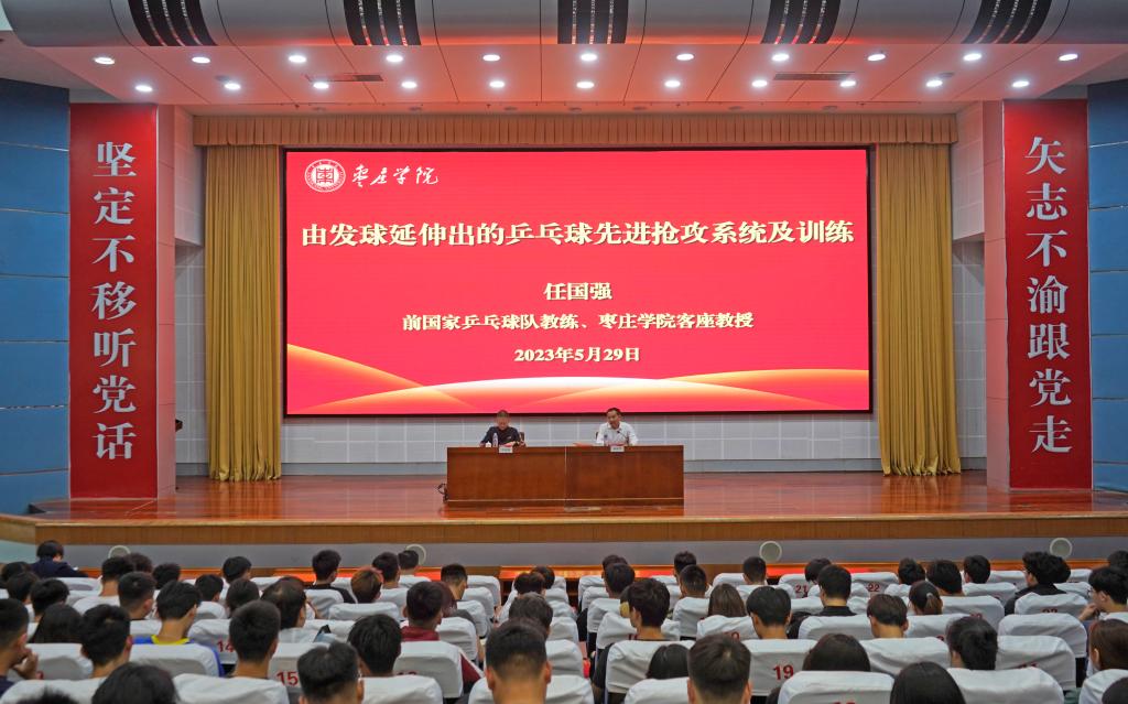 聘任仪式结束后,在综合楼一楼报告厅举行报告会。体育学院党总支副书记、副院长徐德刚教授主持,体育学院党总支书记郭勇和200余名师生参加。任国强教授以《由发球延伸出的乒乓球先进抢攻系统及训练》为题,为同学们讲解了乒乓球先进抢攻系统相关专业理论知识,从发球的意义、技巧和要点进行讲解。他强调,为适应快速多变的时代特征,要将发球技术与第三板抢攻技术、第五板衔接,形成符合自身打法的技战套路。随后,任教授与现场学生对发球抢攻术进行了互动动作演练,分别演练了高抛发球和挥拍中的切、搓、磕等技术,获得满堂喝彩。最后,任教授对学生们提出的长胶、反胶在发球中的作用等问题进行了现场答疑。