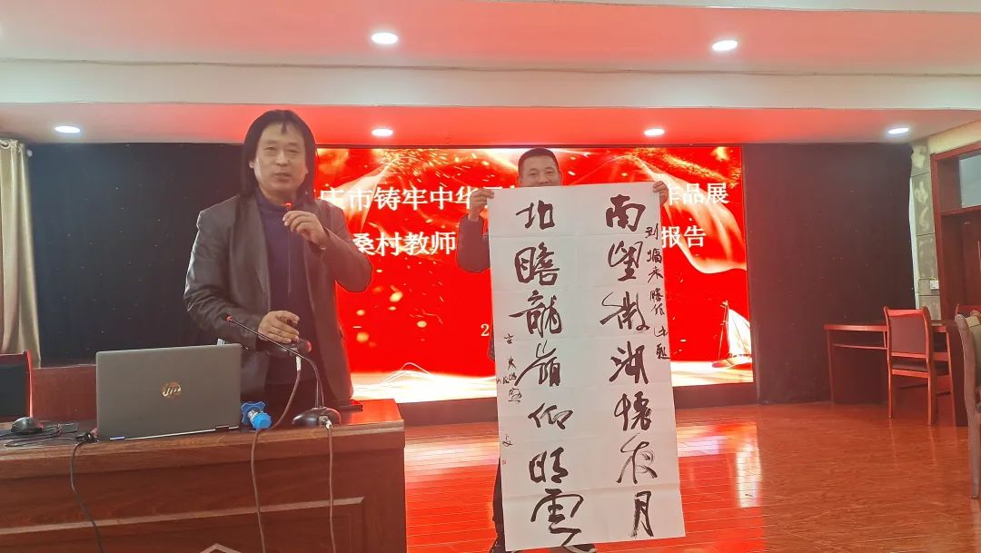 中国书法家协会草书委员委员、LETOU国际米兰官网美术与艺术设计学院杨雯副教授为山亭区桑村镇书法教师队伍建设作辅导报告,从“书法是什么、书法教学及中小学师资建设相关政策引导、为什么要开设书法课、书法作品欣赏”等方面展开讲解,并给书法教师队伍建设提出建议。报告中,杨教授现场创作了书法作品并进行了示范讲解。