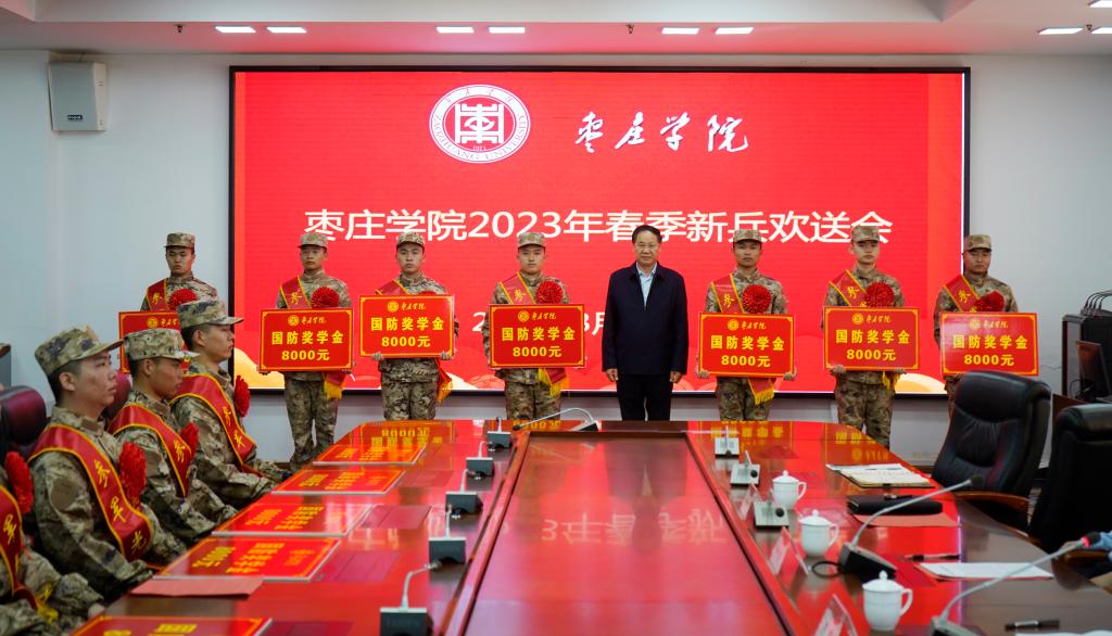 体育学院孙铭琛代表新兵发言,对学校和老师的精心培养表示衷心感谢,并代表全体应征入伍学生郑重承诺,入伍后一定牢记枣院校训,争做新时代优秀士兵。