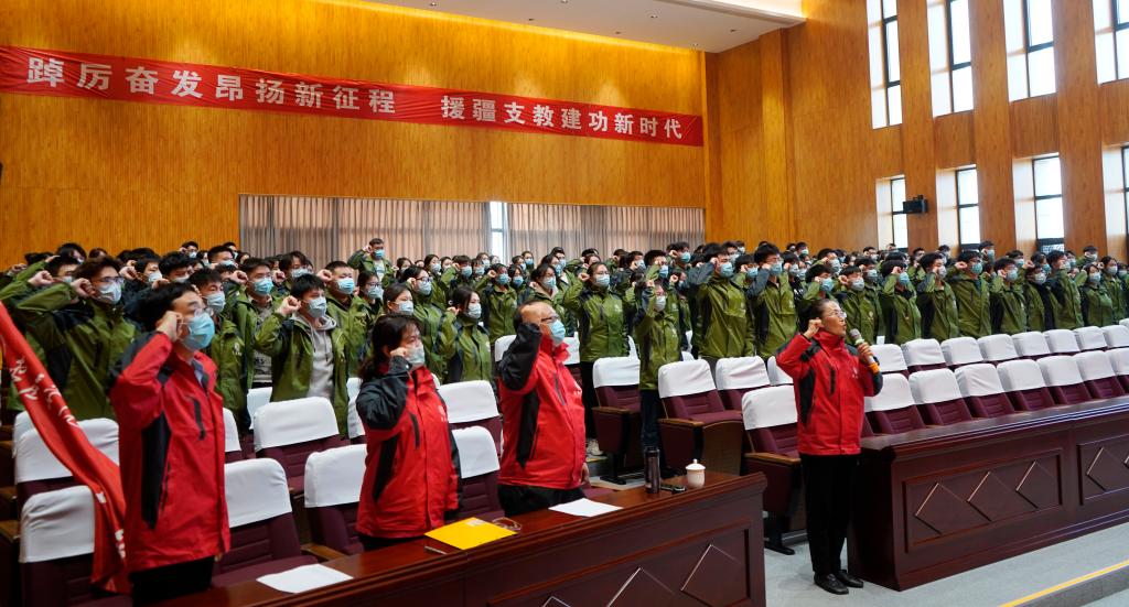 支教团团长宁攀代表带队教师发言,表示将始终忠诚可靠、做到政治过硬,始终真抓实干、做到工作过硬,始终律己率众、做到作风过硬,把援疆工作作为锤炼意志、丰富阅历、增长才干的难得机会,努力为建设团结和谐、繁荣富裕、文明进步的新疆坚守初心、担当使命。音乐与舞蹈学院王祥荟代表支教团学生郑重承诺,将会坚定政治方向,自觉遵守国家民族政策,以争做“四有”好老师为目标,在支教实践中磨炼意志、完善自我、坚守初心,以青春的力量书写时代新篇章。