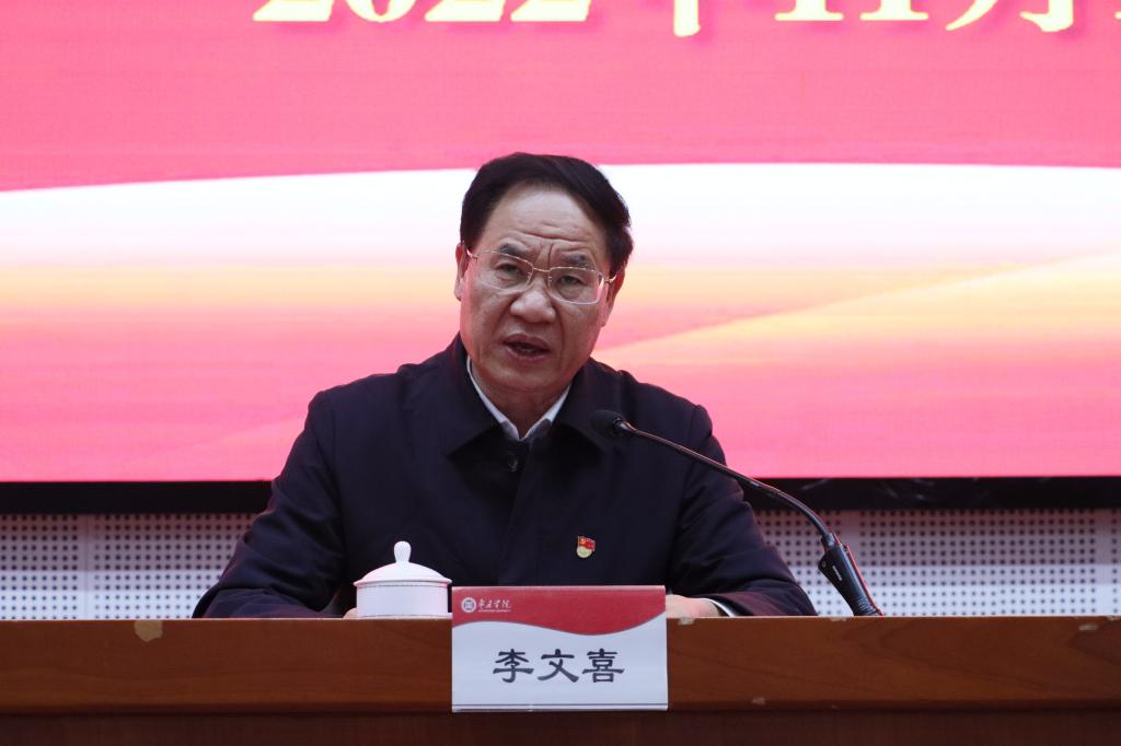 就贯彻落实好会议精神,李文喜提出三点要求:一要强化组织领导。各部门单位要提高政治站位,把学习宣传贯彻党的二十大精神作为当前和今后一个时期的首要政治任务,结合具体实际,制定学习宣讲贯彻方案,加强统筹协调,精心组织实施,确保取得实效,切实用大会精神武装师生头脑。二要坚持正确导向。党的二十大精神宣讲政治性、政策性、理论性强,要以党中央批准的《党的二十大精神宣讲提纲》为基本依据,精心撰写宣讲稿,全面准确开展宣讲。要准确领会本意,深入解读内涵,精准把握外延,防止误读误解、出现偏差,坚决杜绝走过场、搞形式。三要突出教育特色。要遵循教育事业发展规律和学生成长成才规律,紧密联系形势任务的新变化,紧密联系师生员工的新期待,广泛开展内容丰富、特色鲜明、针对性强的学习宣传活动,做到规定动作必到位、自选动作有特色。