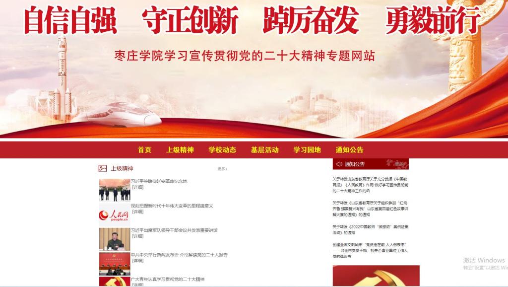 网站分为“上级精神”“学校动态”“基层活动”“学习园地”“通知公告”共5个版块。“上级精神”第一时间聚焦、关注党的二十大召开的动态新闻、重要讲话、中央精神等内容。“学校动态”及时发布学校学习宣传贯彻党的二十大精神的重要新闻。“基层活动”关注学校各基层单位学习宣传贯彻落实党的二十大精神的新闻动态。“学习园地”及时发布权威媒体关于党的二十大精神的理论文章、专家观点、政策解读、理论评论等文章。“通知公告”第一时间发布学校与党的二十大有关的通知,以及围绕党的二十大开展的相关活动。