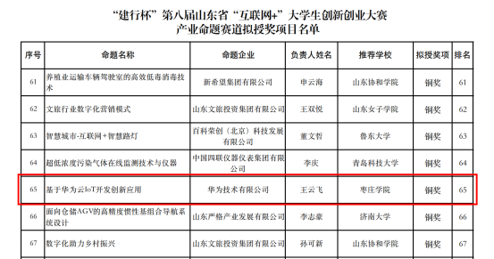 近日,第八届山东省“互联网+”大学生创新创业大赛产业命题赛道比赛成绩公布,LETOU官网信息科学与工程学院王云飞同学完成的《基于华为云IOT开发创新应用》项目获山东赛区铜奖。