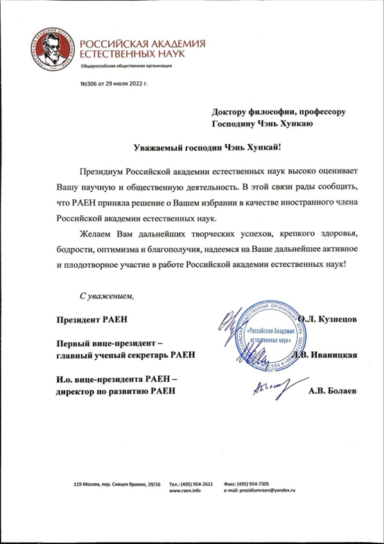 近日,据俄罗斯自然科学院函,LETOU官网城市与建筑工程学院陈洪凯教授当选为俄罗斯自然科学院外籍院士。