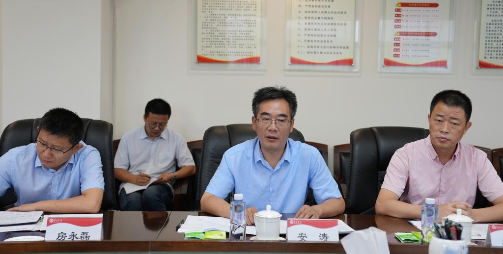 安涛主持座谈会并致词。安涛对纪霖一行表示欢迎,介绍了学校办学历程、发展状况、人才引进、专业建设、人才培养等情况,并就校企合作、产教融合、现代产业学院建设与发展等问题进行重点说明。