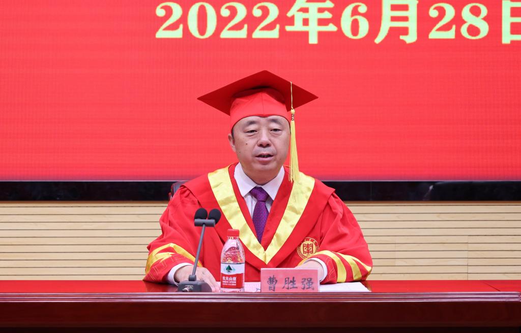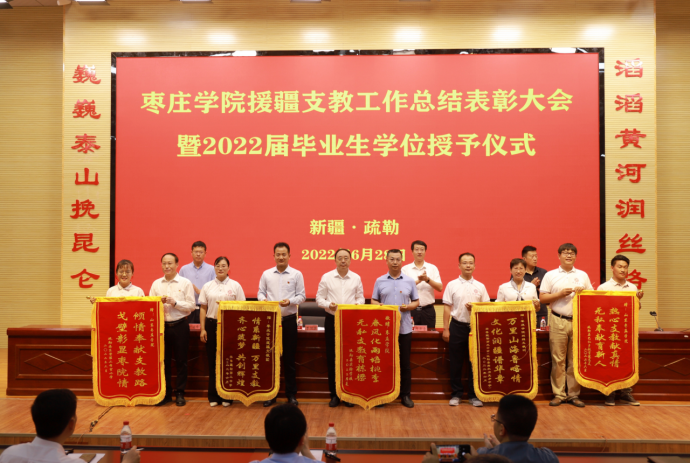 曹胜强要求,支教团全体师生要厚植家国情怀,心怀青春梦想;要肩负青年使命,彰显时代担当;要锤炼坚毅品质,接续奋斗征程,以青春之我、奋斗之我,建功新时代,谱写新篇章。援疆支教的毕业生没有参加学校举办的学士学位授予仪式,为让支教毕业生不留遗憾,学校专门利用这次总结表彰大会机会,为他们举行毕业典礼和学位授予仪式,希望同学们能够把毕业当做一个新的起点,在今后的学习工作中继续发扬支教团精神,保持昂扬斗志,争取在青春的赛道上跑出最好成绩。