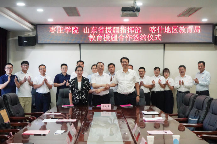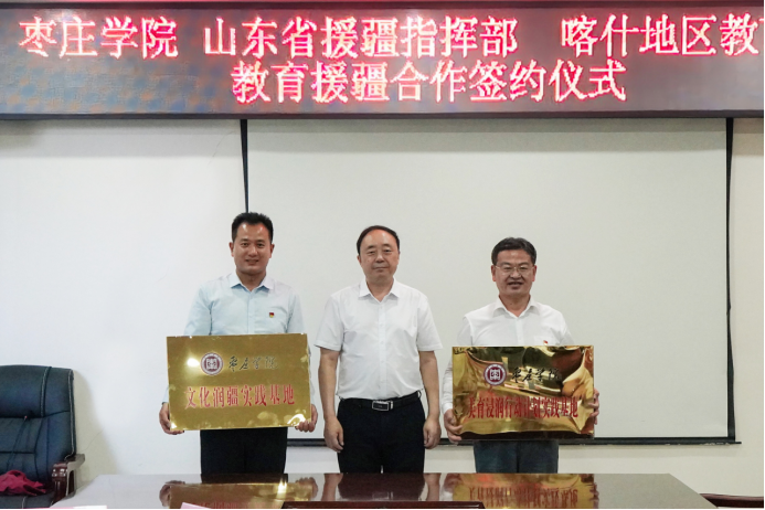 曹胜强代表学校与山东省援疆工作指挥部、喀什地区教育局共同签订援疆支教合作框架协议,协议约定在援疆实习支教、文化润疆、美育浸润行动计划、国家语言文字推广普及以及铸牢中华民族共同意识研究等方面开展全方位合作。