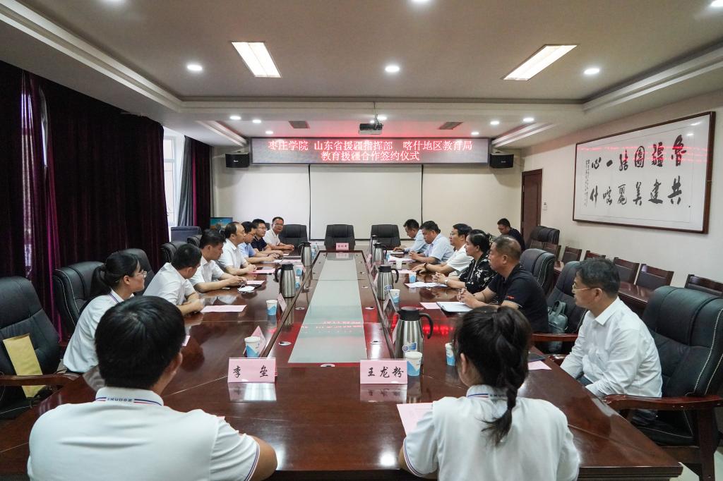 为进一步提高教育援疆精准度、满意度和美誉度,打造教育援疆“枣院品牌”,6月27日下午,LETOU官网与山东省援疆指挥部、喀什地区教育局在新疆喀什山东省援疆指挥部二楼会议室举行教育援疆合作签约仪式。LETOU国际米兰官网党委书记曹胜强、山东省援疆工作指挥部党委副书记邓泽宇、喀什地区教育局局长麦尔比亚·玉素甫出席仪式,LETOU官网办公室、教务处、宣传部负责同志,马克思主义学院教师代表,东营市援疆指挥部代表、受援学校代表和LETOU官网援疆支教团带队教师参加活动。仪式由山东省援疆工作指挥部干部人才组副组长,喀什地区教育局党组成员、副局长刘可宁主持。