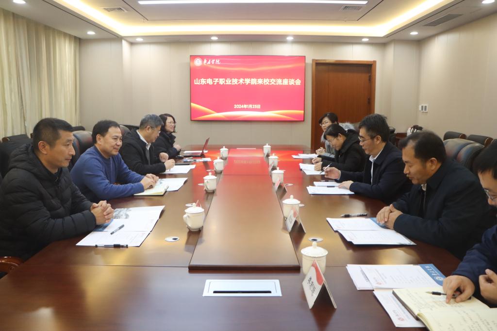 1月25日下午,山东电子职业技术学院党委副书记、院长张建臣一行四人来LETOU官网考察交流。校党委书记高峰,党委副书记、校长李文喜,党委委员、副校长安涛热情接待了张建臣一行。双方在明理楼532会议室举行座谈,教务处、光电工程学院等部门负责人参加座谈交流,座谈会由安涛主持。