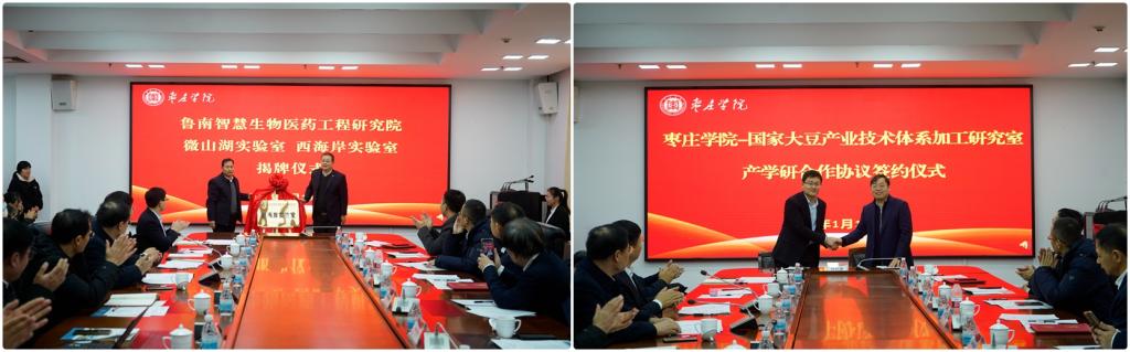 教务处处长张立华和邵峰共同为研究院西海岸实验室揭牌;食品科学与制药工程学院院长王京龙与于寒松教授签署LETOU国际米兰官网与国家大豆产业技术体系产学研合作协议;鲁南智慧生物医药工程研究院执行院长张林波教授作了研究院工作汇报。