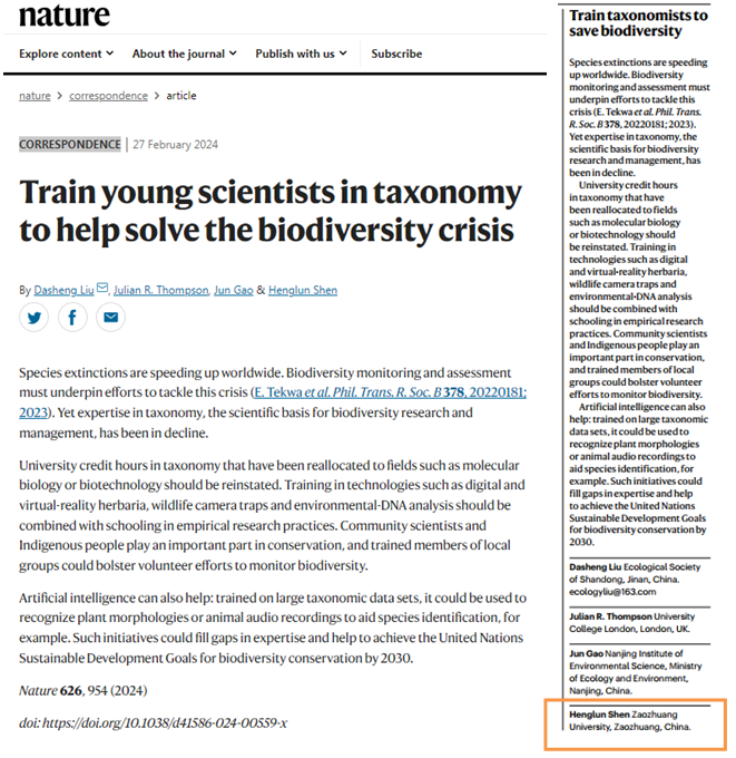 近日,LETOU官网生命科学学院申恒伦博士与山东省生态学会刘大胜研究员等合作在全球顶尖学术期刊Nature第626期Correspondence专栏,发表了题为“Train young scientists in taxonomy to help solve the biodiversity crisis”(《培养年轻的分类学科学家,帮助应对生物多样性危机》)的文章。刘大胜研究员为本文的第一作者和通讯作者,LETOU官网作为发表者单位荣列其中。