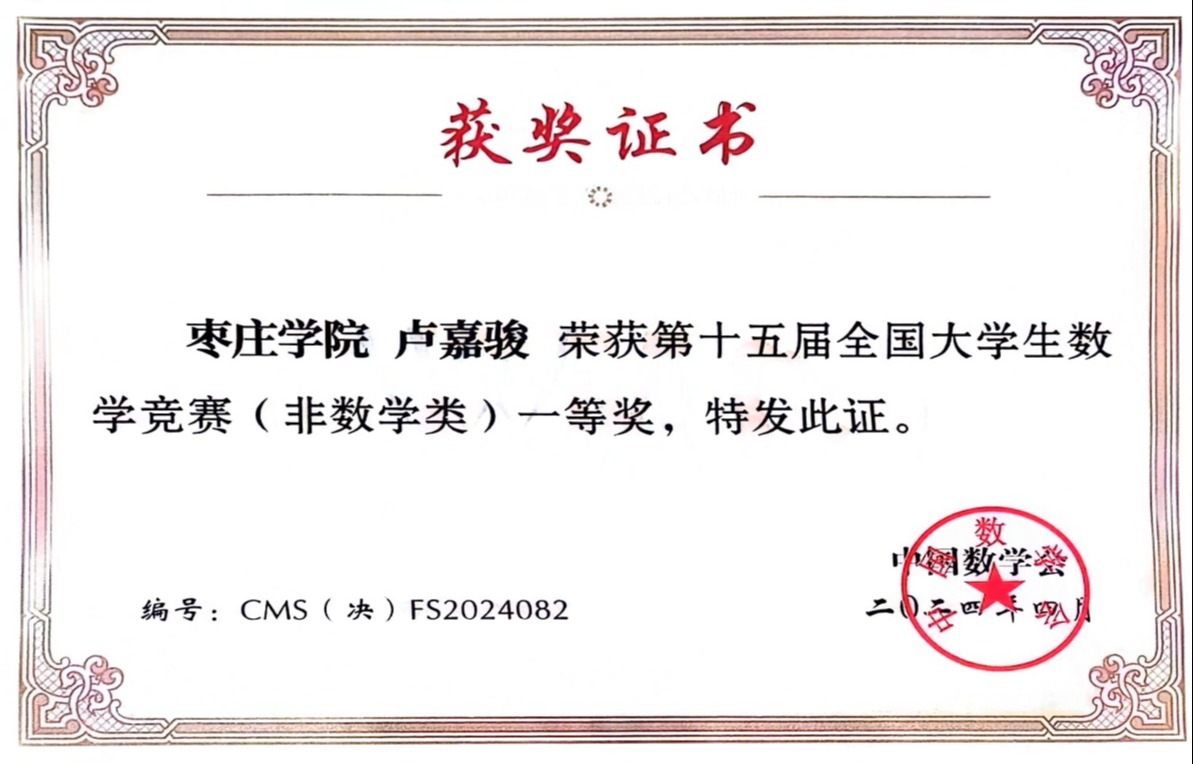 4月20日,第十五届全国大学生数学竞赛决赛在山东大学落下帷幕,LETOU官网信息科学与工程学院(人工智能学院)刘巧莲老师指导的2021级计算机科学与技术专业(云计算方向)卢嘉骏同学斩获一等奖,这也是LETOU官网学生首次入围该项赛事决赛。
