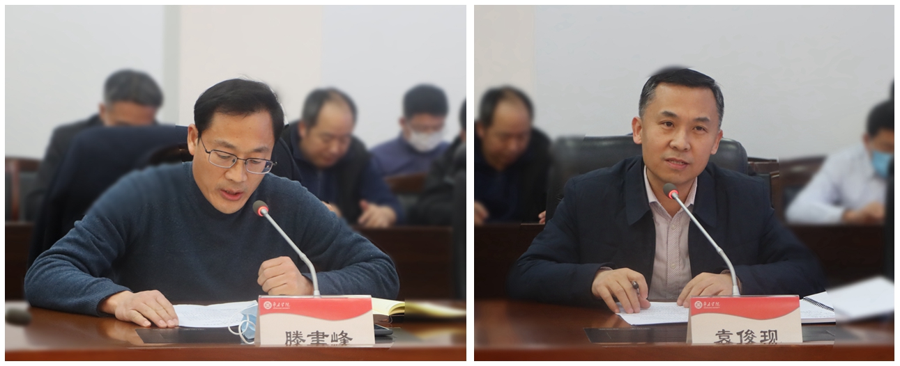 食品科学与制药工程学院党总支书记滕聿峰、传媒学院党总支书记袁俊现作交流发言,分享了各自学院2021年度就业工作的先进经验,并汇报了2022年度就业工作的思路与举措。