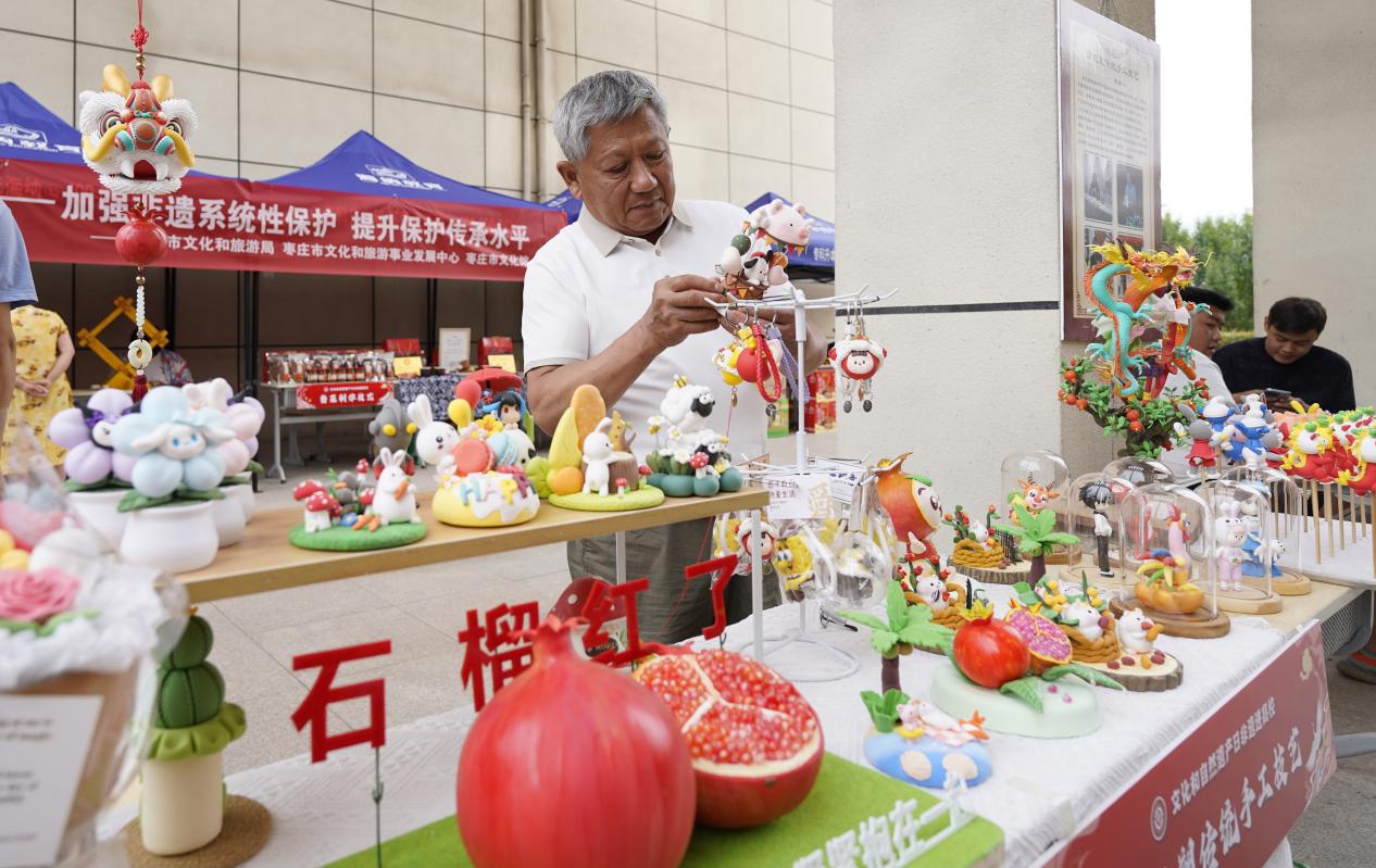 在非遗项目展示区,鲁班技艺、尚岩土陶等几十位枣庄市的非遗传承人们各显本领,在摊位前现场制作、展示非遗技艺。大学生们兴致盎然,或驻足观看或跃跃欲试,活动现场人头攒动、热闹非凡。教学成果展区设有非遗技艺、班墨文化、石榴文化、红色文化和儿童绘本创作五个展区,展示了学生精心制作的剪纸、尚岩土陶、漆扇等24种传统非遗作品。另外,参展的非遗技艺传承人还带来了精彩的舞狮、柳琴戏和花棍舞表演。在非遗集市,前来参展的师生们亲自动手参与制作非遗作品,探索非遗韵味,感受传统文化的魅力。