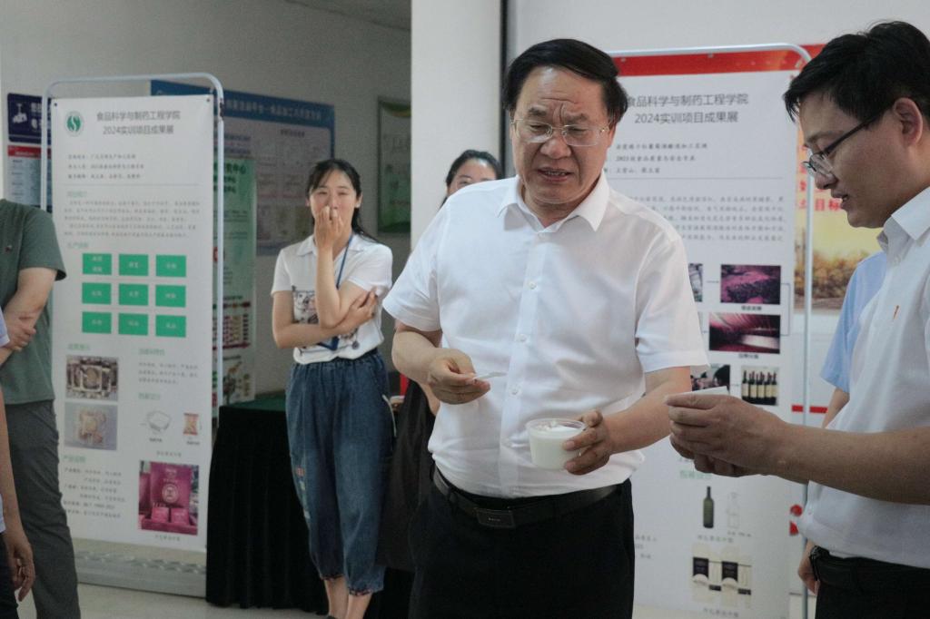 在参观过程中,李文喜与师生进行亲切交流,认真听取实训周活动安排,详细询问了实训产品加工工艺和创新理念与特色。李文喜对实训产品给予高度评价。他指出,班墨文化的精神内涵与应用型人才培养的要求高度一致,利用校内食品药品中试车间,以“校中厂”模式开展实战化、标准化的实训活动,不仅锻炼了学生的工程实践能力,培养了创新意识和工匠精神,对推动班墨文化引领应用型人才培养也具有重要意义。