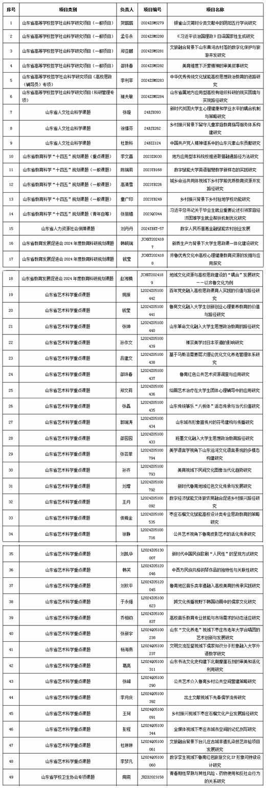 学校获批立项山东省高等学校哲学社会科学研究项目6项,其中面上项目4项、高校思政(辅导员)专项1项、科研管理专项1项;获批立项山东省教育科学“十四五”规划2023年度课题5项,其中重点课题1项、一般课题3项、自筹课题1项;获批山东省民族宗教委重点课题12项;获批立项2024年度人文社会科学课题一般项目3项,其中资助项目1项、自筹项目2项;获批山东省艺术重点课题30项;获批山东省人力资源社会保障课题1项;获批山东省学校卫生协会专项课题 1项;获批2024 年度枣庄市社科联应用研究课题25项,其中一般课题16项,习近平文化思想专项、廉洁建设专项等专项9项。