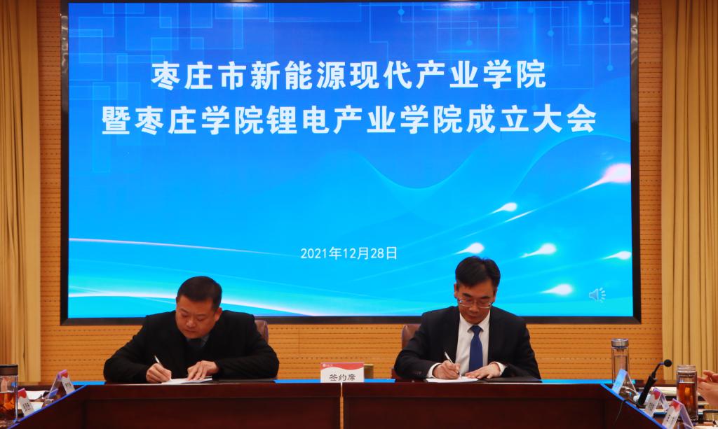 枣庄市能源局局长刘忠波介绍了枣庄市新能源产业情况。副校长安涛代表学校与山东精工电子科技有限公司、山东丰元锂能科技有限公司、山东天瀚新能源科技有限公司签署合作共建协议。