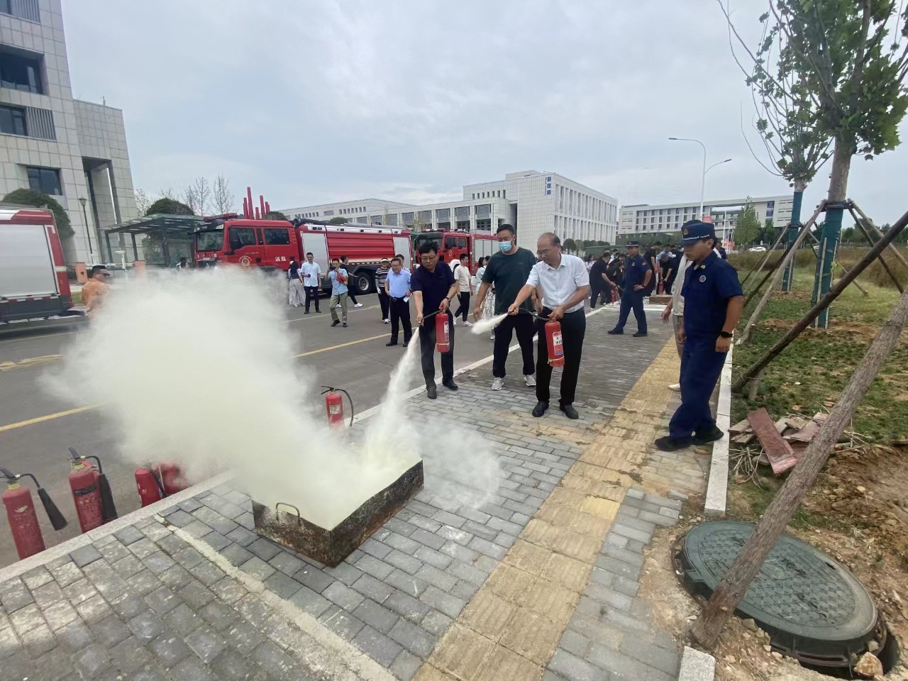 本次培训演练理论部分,主要是结合身边火灾案例,重点从提高消防安全“四个能力”进行培训;实操部分主要从“灭火器的使用,消火栓、水带、枪头连接喷水,常见消防设施的功能及使用”三个方面进行演练。演练中,参训人员分两组通过“提、拔、握、压”四个步骤使用灭火器进行模拟灭火演练,直观体验了灭火器的使用方法;水带连接环节,参训人员在消防救援大队工作人员专业指导下,亲身体验了抛水带、连栓头、接枪头、开阀门、喷水整个流程;随后大家现场参观了常见消防设施及装备。