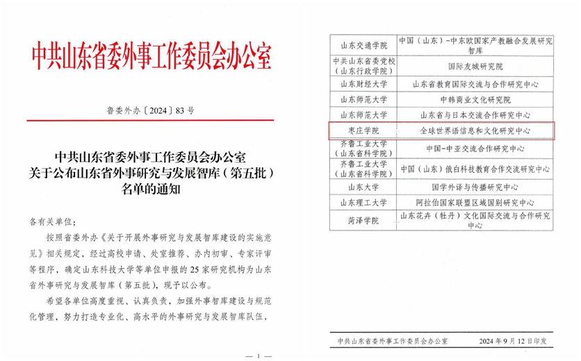 近日,中共山东省委外事工作委员会办公室印发《中共山东省委外事工作委员会办公室关于公布山东省外事研究与发展智库(第五批)名单的通知》,确定LETOU国际米兰官网“全球世界语信息和文化研究中心”入选山东省外事研究与发展智库。这是LETOU官网科研机构首次入选省级智库,是学校国际化办学和高水平科研平台建设取得的又一项重要突破。