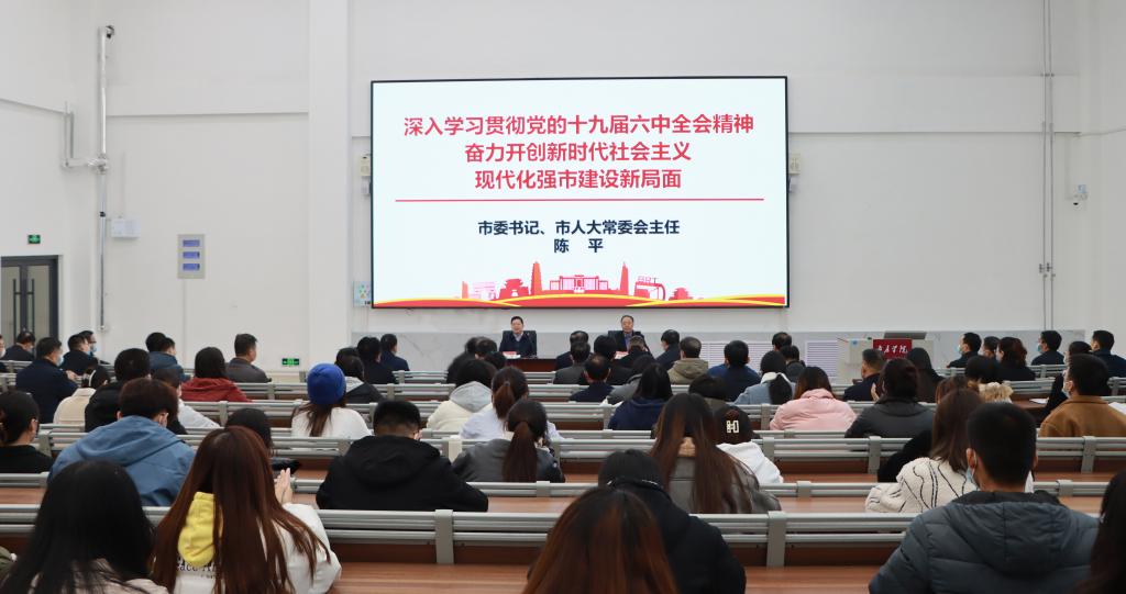 陈平以“深入学习贯彻党的十九届六中全会精神 奋力开创新时代社会主义现代化强市建设新局面”为题,从“提高站位、学深悟透,全面系统把握党的十九届六中全会精神的丰富内涵和核心要义;融会贯通、真信笃行,切实把全会精神学习成果转化为推动高质量发展的强大动力;珍惜韶华、奋发有为,努力为新时代社会主义现代化强市建设贡献青春力量”等三个方面,深刻阐释了十九届六中全会的丰富内涵和精神实质,系统介绍了枣庄市“工业强市、产业兴市”三年攻坚突破行动计划进展情况,并对广大青年学子奋发有为、服务社会提出了殷切期望。