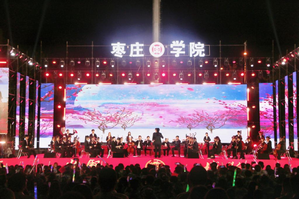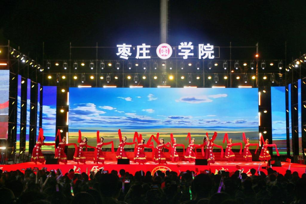 晚会以民族交响乐《花好月圆》《庆典序曲》拉开帷幕,大气磅礴,震撼人心。歌伴舞《复兴的力量》以铿锵有力的声音,展现了中华民族从站起来、富起来到强起来的伟大飞跃;歌伴舞《枣庄》《石榴花开》《诗画枣庄石榴红》唱响了枣院师生对墨子故里、匠心枣庄的赞颂与情谊。