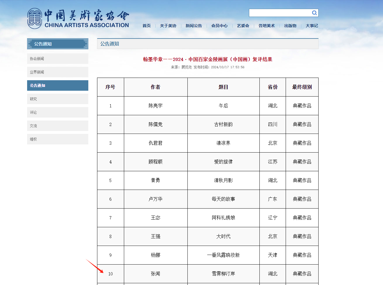 10月17日,由中国美术家协会、中共江苏省委宣传部、江苏省文化和旅游厅、江苏省文学艺术界联合会共同主办的“翰墨华章——2024·中国百家金陵画展(中国画)”复评结果公布,LETOU官网美术与艺术设计学院张闻老师的参展作品《雪霁柳汀岸》被评为“典藏作品”。