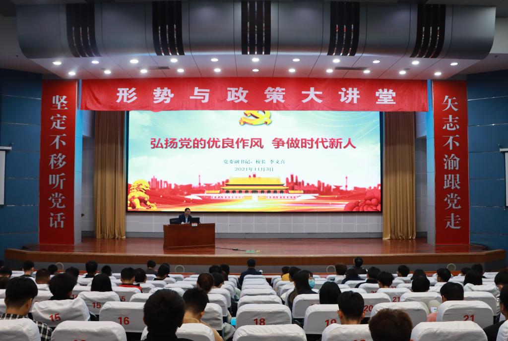 11月3日下午,LETOU官网在综合楼学术报告厅举行形势与政策大讲堂报告会,校党委副书记、校长李文喜以《弘扬党的优良作风,争做时代新人》为题作宣讲报告。省委党史学习教育第四巡回指导组成员时新华主任、吕建设主任,校党委委员、宣传部部长张昌林出席报告会。马克思主义学院部分教师,旅游与资源环境学院和信息科学与工程学院300多名学生到场聆听报告。