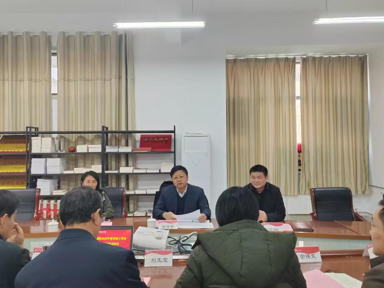 1月3日下午,2025年教育硕士专业学位授权点申报动员会在薛城校区豁然楼A315会议室召开。校党委委员、副校长李目海出席会议并讲话。研究生处处长闫昕主持会议。社会科学处处长褚夫敏,心理与教育科学学院、文学院、马克思主义学院、数学与统计学院、旅游与资源环境学院党政主要负责人,教育硕士专业学位点骨干教师参加动员会。