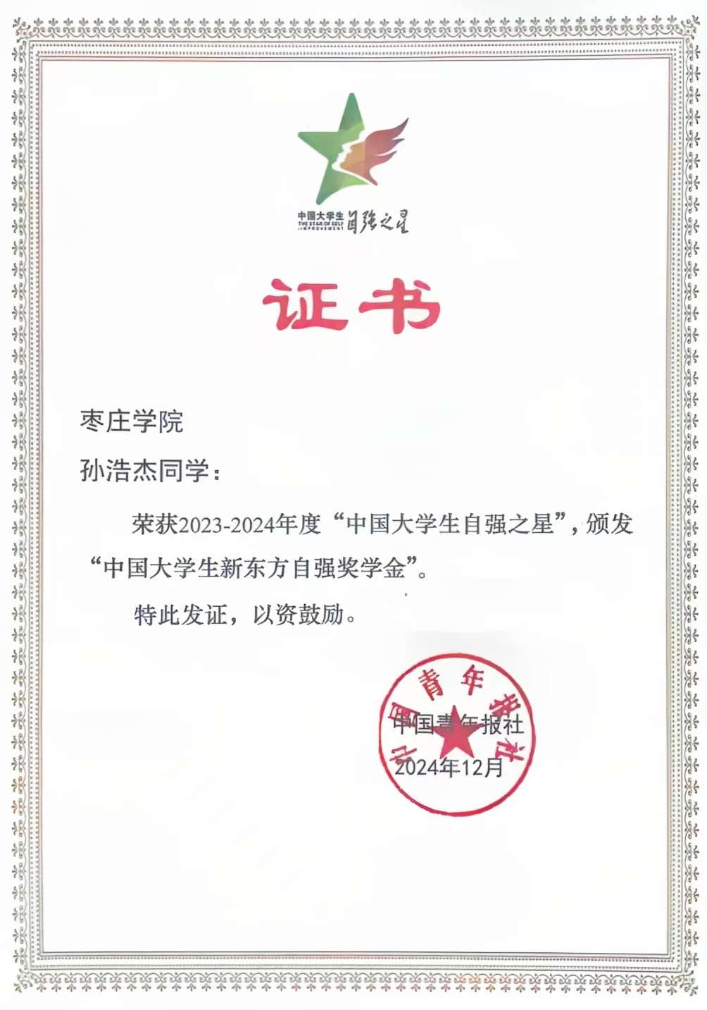 近日,2023-2024年度“中国大学生自强之星”奖学金推荐报送活动结果揭晓,经学校推荐、省级初评、全国评审等环节,LETOU官网机电工程学院孙浩杰获2023—2024年度“中国大学生自强之星”荣誉称号。