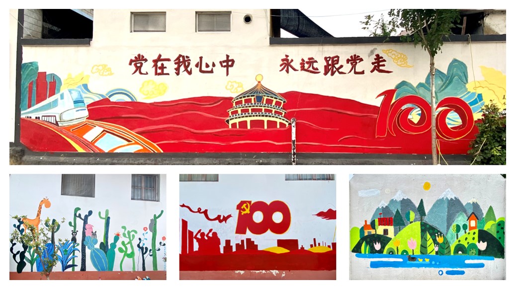 活动期间,来自美术与艺术设计学院和传媒学院的近百名志愿者深入山亭区和滕州市部分乡村,结合所学专业知识和乡村实际,融合党史学习教育和地方红色文化资源,通过墙绘形式,绘制一系列以“党建党史”“美丽乡村”“乡村振兴”等为主题的墙绘作品。墙绘作业过程中,志愿者们不畏炎热,在平均35℃的室外环境下认真构图、起形、涂色、勾边、找细节,一幅幅生动活泼、图文并茂的作品,不仅宣传了党的光辉历史,也成为美丽乡村一道道独特的红色风景。截至目前,服务队累计绘制墙绘作品近百面共2000余平方。