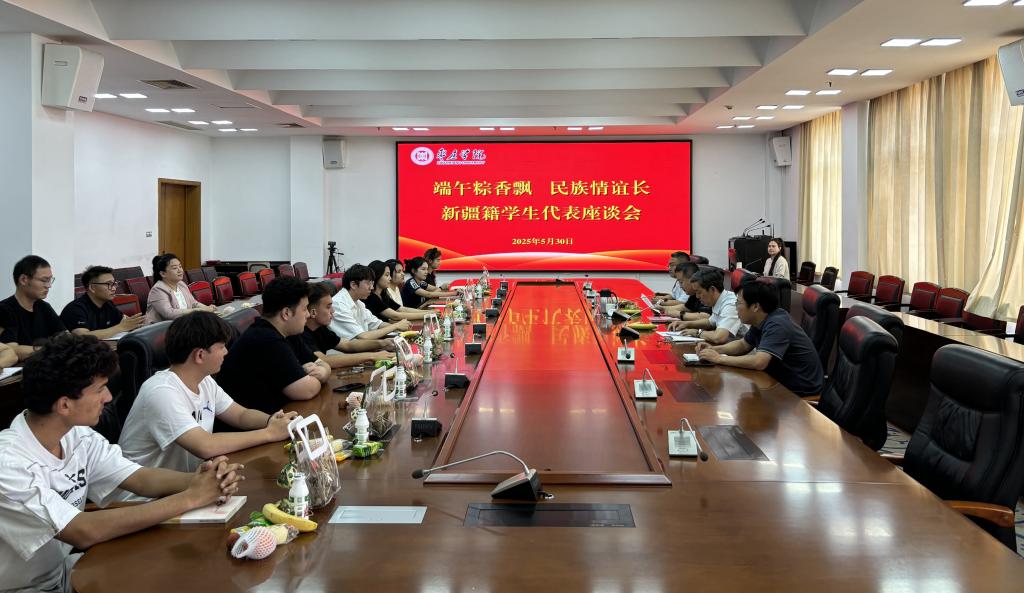 丰雷详细了解同学们的学习和生活情况,指出学校始终高度重视新疆籍学生的成长与发展,通过开展学业帮扶、组织文化交流活动等方式,为大家提供全方位支持。同时,他对同学们提出三点希望:一是共筑文化认同,做民族团结的促进者。希望同学们积极参与学校组织的传统文化活动,主动分享新疆的民俗风情,让更多师生了解新疆的历史文化和发展成就,让“中华民族一家亲”的理念扎根心田;二是厚植家国情怀,做时代精神的弘扬者。希望同学们珍惜在学校的学习机会,推动各民族同学交流交往交融,相互尊重、相互学习,同时将个人理想与祖国发展紧密结合,在志愿服务、社会实践中学以致用,用专业知识服务民族地区建设,展现青年担当,成为新时代的“石榴籽”。三是要以学为基,做追求卓越的奋斗者。希望同学们树立远大理想,将个人成长与国家发展紧密结合,努力学习专业知识,提升综合素质,以“时不我待”的紧迫感做好学业规划,以“粽叶”包裹知识之米,以“丝线”系紧专注之力,在求知路上扎实前行。