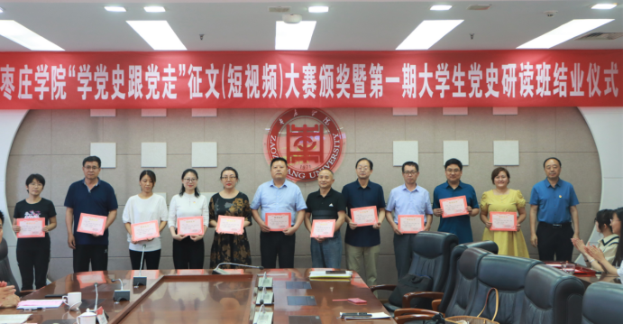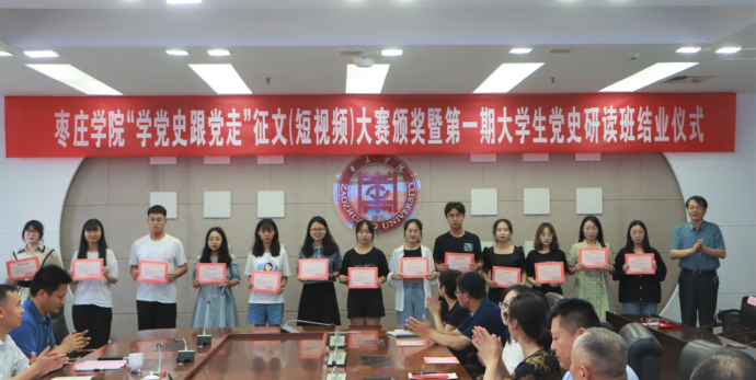 会议第一阶段对征文(短视频)大赛获奖师生进行表彰,由曹胜强、曾宪明分别为教师和学生代表颁奖。第二阶段对党史研读班前一阶段工作进行全面总结,优秀党员代表讲授微党课,教师代表进行发言,并为学员颁发结业证书。本次活动以推动“777互联互通育人工程”和“七个一行动计划”发展,构建思政育人大格局为宗旨,为师生提供了一次生动的现场教学,有助于推动党史学习教育和思政实践教学的形式及模式创新。