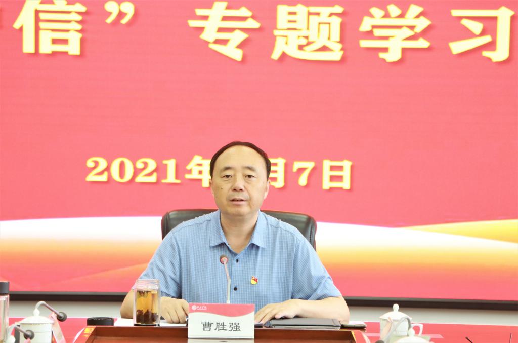 为进一步增强“学史增信”的全面认识,开展好专题学习,曹胜强提出四点要求:一要深刻认识学史增信的重大意义,是不断推动我们党的事业从胜利走向新的更大胜利的必然要求,是统揽伟大斗争、伟大工程、伟大事业、伟大梦想,不断推动我们党的事业从胜利走向新的更大胜利的必然要求。学习党的历史,就要筑牢信仰之基,不断增强信仰信念信心。二要教育引导广大党员、干部牢记初心使命,始终坚定“四个自信”,准确把握学史增信的科学内涵,增强信仰、信念、信心,勇敢战胜困难和挑战,努力创造属于我们这一代人、无愧于新时代的历史功绩。学史增信就是要通过学习党的不懈奋斗史、理论探索史和自身建设史,增强对马克思主义的信仰、对中国特色社会主义的信念、对实现中华民族伟大复兴中国梦的信心、对党中央的信赖。三要教育引导广大党员、干部,以坚定理想信念为根基,系统领会学史增信实践要求,把“增信”成效转化为悟思想、办实事、开新局的实际行动。学史增信,要以坚定信念指导理论学习,要把“增信”与悟思想、办实事、开新局相贯通。在学史中积聚信心之力,增强“想干事”的思想自觉、提升“能干事”的能力水平、锤炼“干成事”的过硬作风,围绕学校第三次党代会提出的目标任务,紧盯年度各项重点工作,将党史学习教育焕发出来的信仰信念信心,转化为攻坚克难干事创业的实际成果,为学校事业发展凝聚强大合力,积极推进国内一流应用型大学建设。四要把学史增信同做好高校思想政治工作结合起来,培根铸魂,引导广大青年学生牢固树立正确的国家观、历史观、民族观、文化观,着力培养德智体美劳全面发展的社会主义建设者和接班人。要始终坚持把立德树人作为根本任务、把服务国家作为最高追求、把学科建设作为发展根基,把深化改革作为强大动力、把加强党的建设作为坚强保证。要坚持用党的光荣传统和优良作风坚定信念、凝聚力量和温润初心,用信仰信念和信心照亮奋斗之路,奋力走好全面建设社会主义现代化的新长征路。