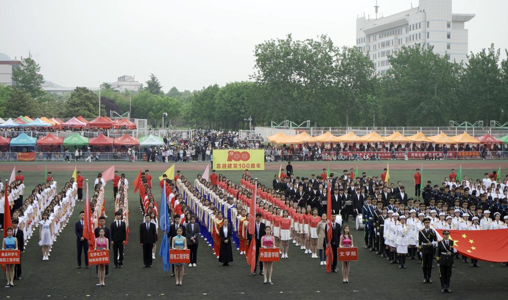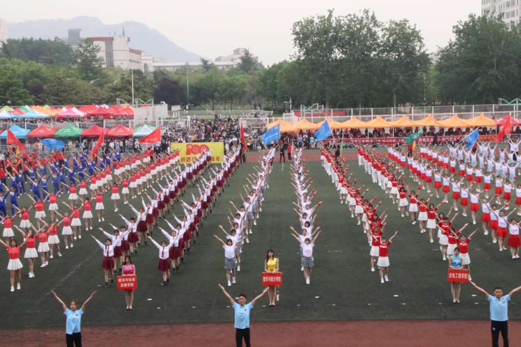 由体育学院舞蹈表演专业学生和各学院方队带来的团体操表演《没有共产党就没有新中国》将开幕式现场气氛推向高潮。激昂青春的旋律,整齐划一的队列、矫健有力的身姿,不时赢得全场阵阵掌声。近一千名同学踏着整齐的节拍共同起舞,淋漓尽致展现了对伟大祖国的热爱之情、对中国共产党百年华诞的祝福之意、对中华传统体育文化的传承之心,也体现了枣院学子朝气蓬勃的精神面貌。