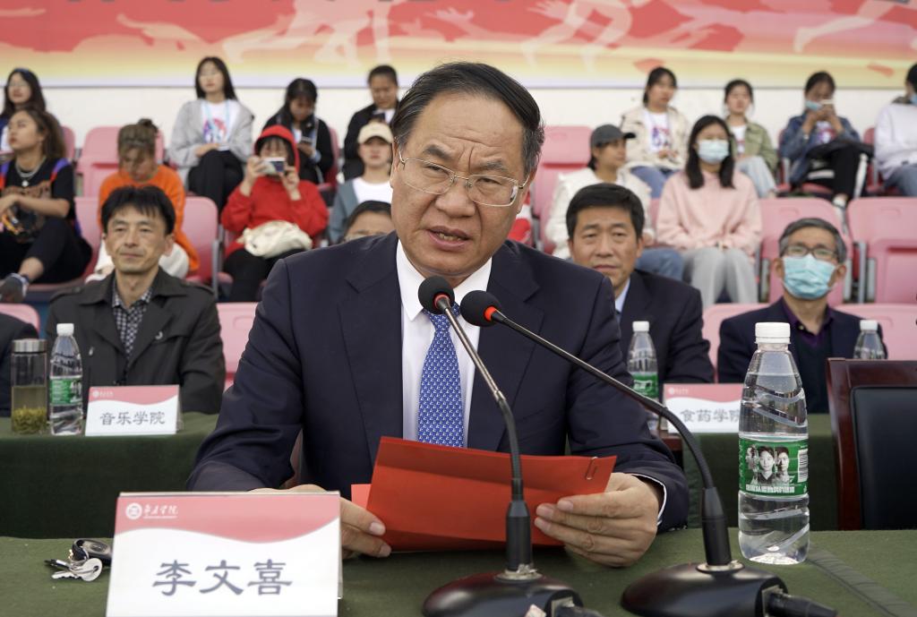 李文喜在闭幕式上讲话,代表学校及运动会组委会对在本届运动会中取得优异成绩的单位和个人表示热烈祝贺。他希望全体师生以本次运动会为契机,积极参加体育锻炼,不断提高身心素质,磨练意志品格,培养团队精神,打开思想境界,激励奋斗人生;把在运动会上所激发出来的合作理念、集体观念、拼搏精神、竞争意识,带入到日常学习工作中去,内化为推动学校追赶超越和开创自己未来事业的不竭动力,为早日建成国内一流应用型大学作出新的更大贡献。
