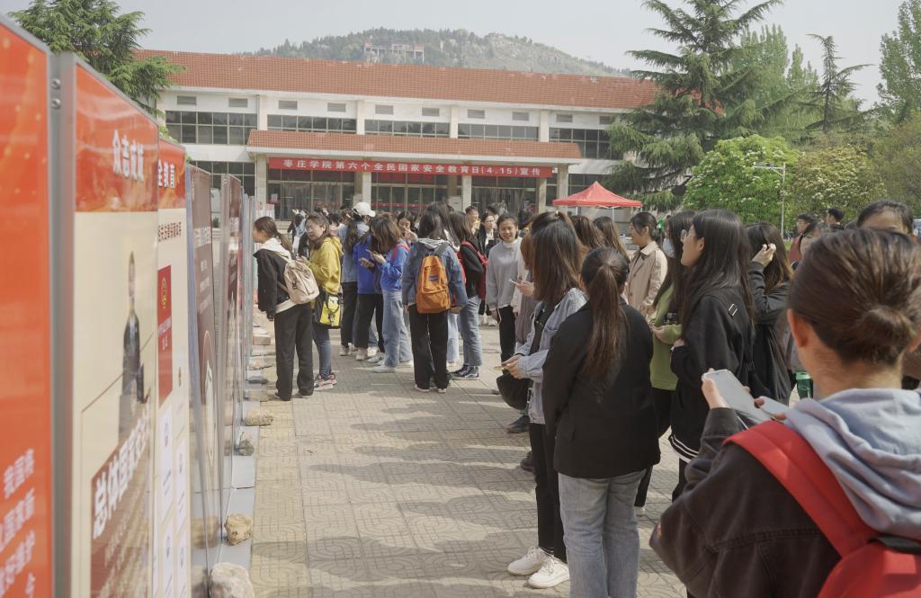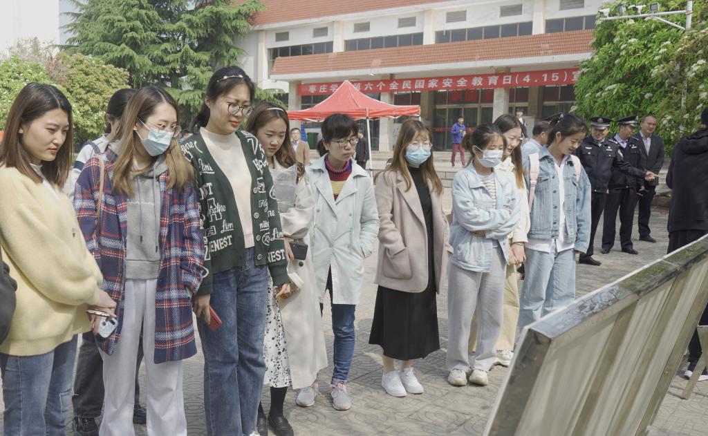 活动现场,悬挂着宣传条幅,播放着国家安全知识,公安干警和校保卫处工作人员将宣传资料发放到师生手中。现场整齐排列着精心制作的47块展板,包括国家安全和反邪教两大板块内容。在办公室、保卫处及部分二级学院负责人陪同下,曹胜强仔细观看展板,认真倾听国安、公安部门领导的现场讲解,频频点头并不时交流。他要求,相关部门要积极引导师生牢固树立“国家利益高于一切,国家安全人人有责”的思想,努力践行总体国家安全观,为建设平安中国、守护平安校园贡献力量。
