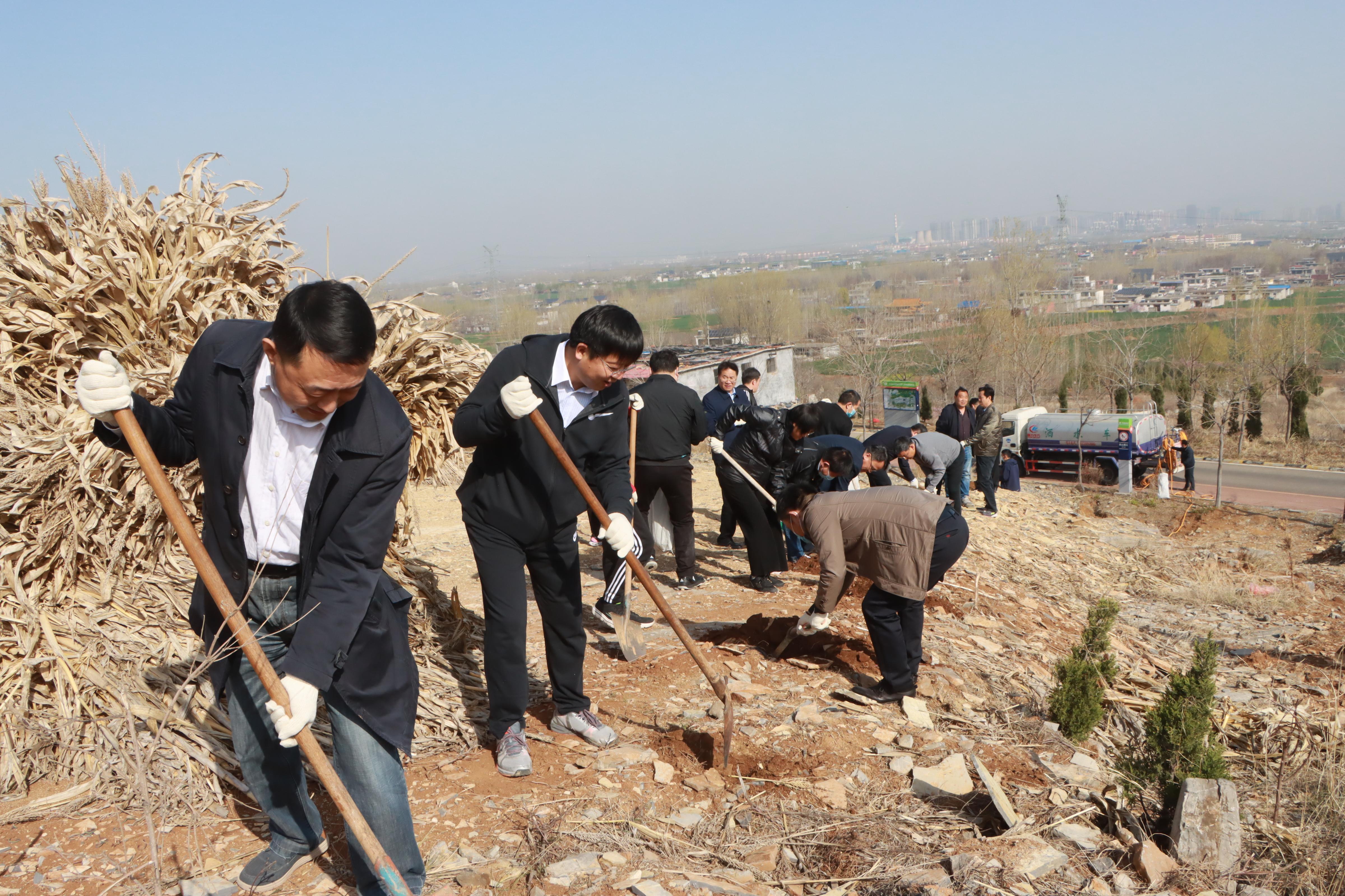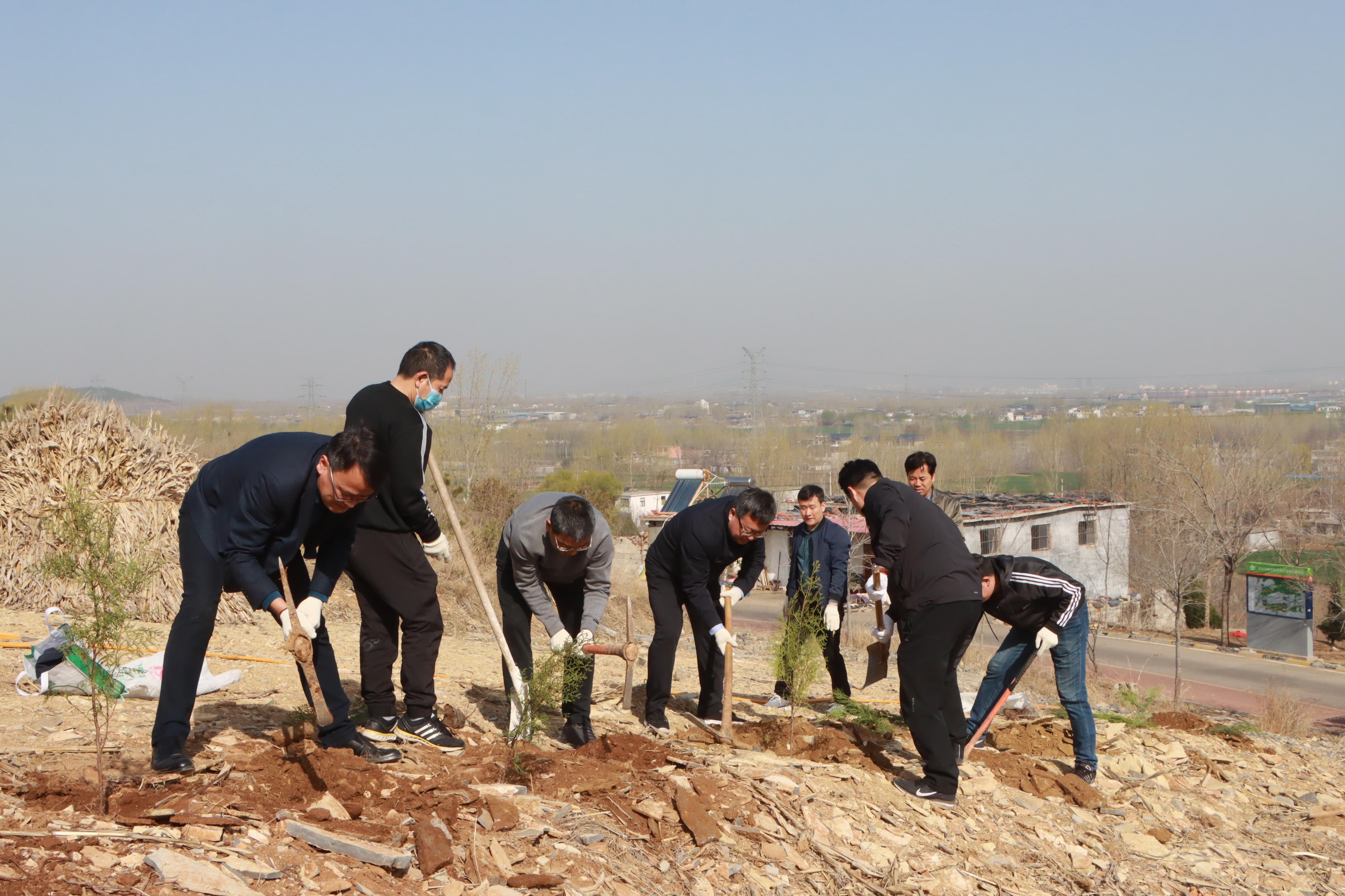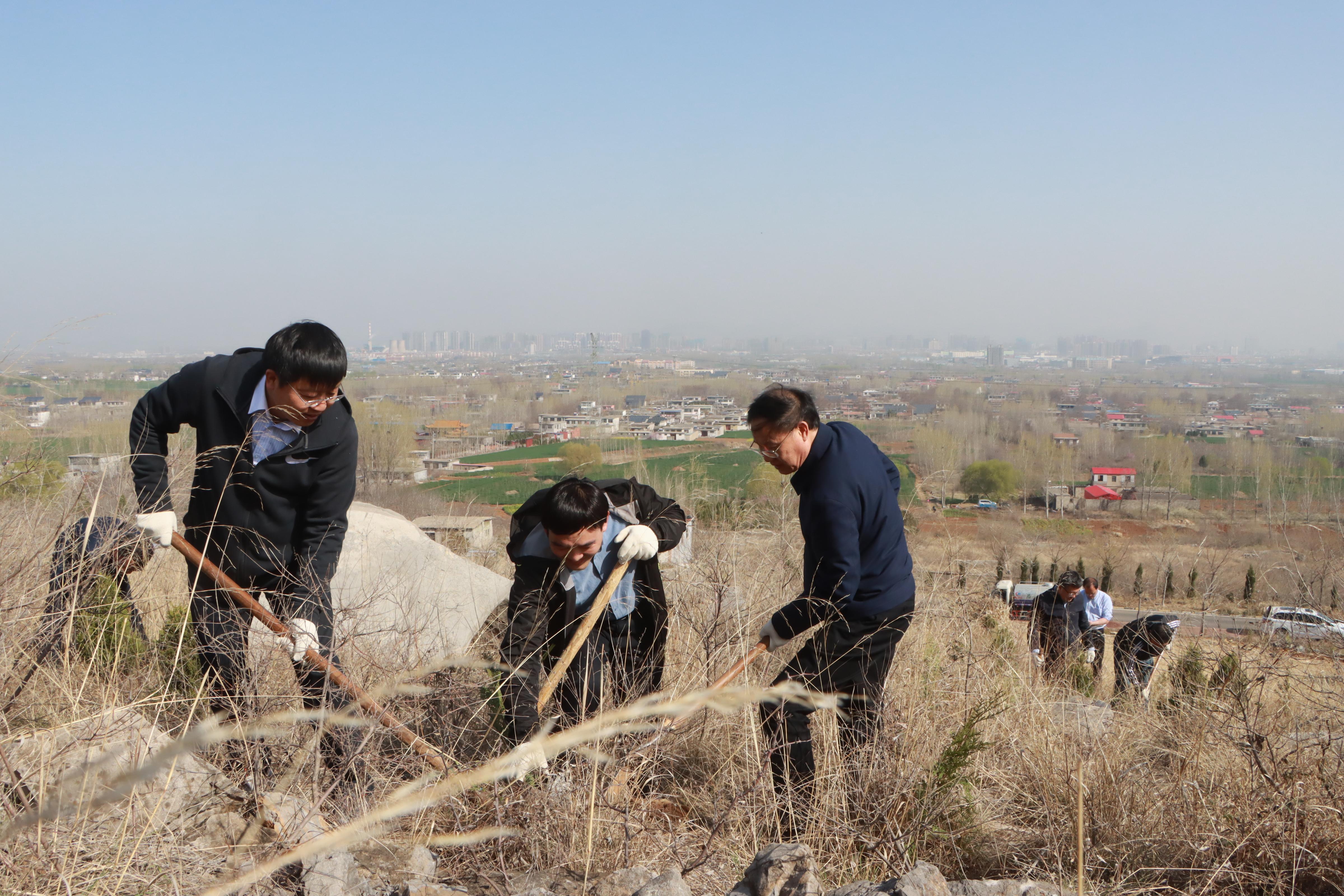 大家一下车,就拿起铁锨、锄头、树苗等径直走向植树点山头。伴着和煦的春风,开始了植树活动,校领导与大家一起挽起衣袖,拿起铁锨,为一棵棵新树苗安置新家。大家分工合作、配合默契,有的挥锹铲土、扶苗填坑,有的踏土夯苗、浇灌扶正……每一道工序都做得仔细严谨,一丝不苟。