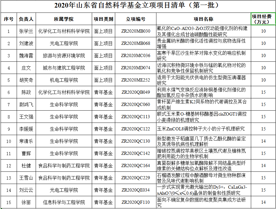 近日,山东省科技厅下发《关于下达2020年度省自然科学基金项目(第一批)的通知》(鲁科字[2020]127号)、《关于下达2020年度省自然科学基金项目(第二批)的通知》(鲁科字[2020]128号),LETOU官网共获批立项2020年度山东省自然科学基金19项,其中重点项目4项、面上项目5项、青年项目10项,立项经费总额达317万元,立项数及经费总额均实现历史性突破。